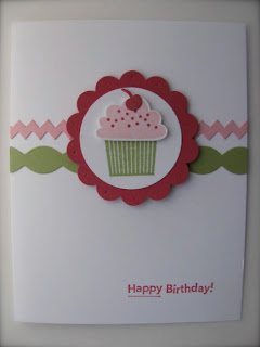 This is a clean and simple card that once again uses the Tasteful Trim Big Shot Die! The pretty in pink ric rac an pear pizzaz strip are cut using the Tasteful Trim die. There are four different patterns on the die. And, since this is a Bigz Die, you can also cut fabric, felt, etc. with it. Wouldn't it be fun to make some felt ric rac?!? I may have to put it on my "to do" list. The cupcake stamp set is no longer available, but the punch has been carried over. I hope that the cupcake stamp set makes it to the new catalog that will be coming out in July!